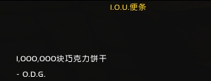 Armsmaster Holinka的旁边墙上有一张便条,上面写着“I.O.U.Note(欠条)1,000,000 Chocolate Chip Cookies- O.D.G.”