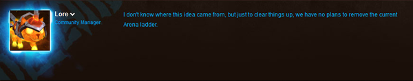 “不清楚是这种想法从何而来,不过我可以澄清一下,我们并没有移除现有竞技场天梯的计划。”