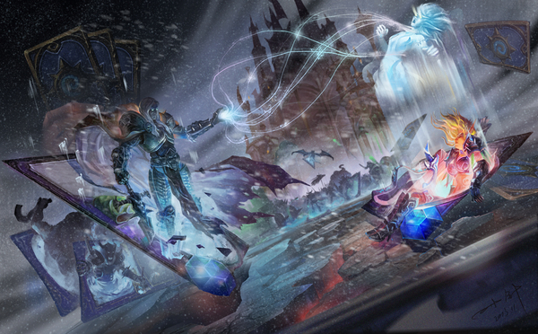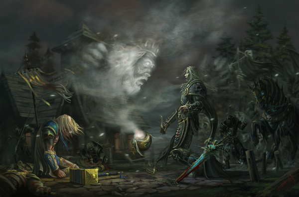 炉石卡牌的情景画作,阿尔萨斯是如何将希尔瓦娜斯变为女妖之王,以及击杀乌瑟尔抢夺泰瑞纳斯骨灰瓮的场景片段,很赞哦。
