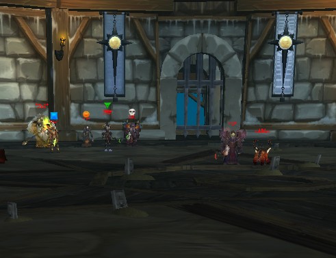 这几个身骑白马的骨头架子难就难在不能扎堆让四十个人围成一圈来暴艹——每一个死亡骑士都有着专属于自己的半径奇大的伤害光环,彼此可以堆叠,如果哪个公会胆子大到敢把他们几个拉在一起,手还没打热的时候恐怕全团就要被光环秒完了……即便把他们分别拉到四个角贴墙,也仅仅只有偌大场地中间的一小片区域可以用来调整,戏称休息区。