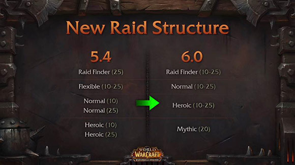 弹性改名为普通,普通改为英雄,英雄改为史诗(或称神话)。随机、普通、英雄难度人数全部弹性化。史诗难度人数固定20人。所有难度CD分开。