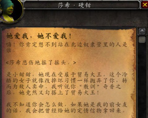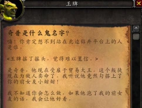 亲爱的小甜甜,我跟随部落来到卡利姆多,才得知这个该死的杂碎是个不折不扣的事儿爹,在艾泽拉斯的其他地方为非作歹:
