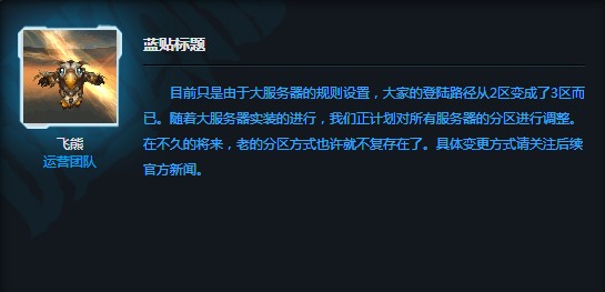 在解答玩家关于大服务器实装之后二区破碎岭在登录时需要从三区登陆这一变化的疑问时,国服蓝帖发言人飞熊透露了另一重大消息:在大服务器完全时装后,我们会逐渐改变现有的服务器分区方式,以后可能不再会有第一大区,第二大区这样的分区了!