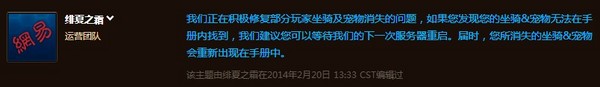 目前有小伙伴反应在维护过后自己的某些坐骑消失不见,官方称正在解决,下一次服务器重启后坐骑和宠物就会出来,你也可以把自己的相关信息回复给官方客服。请大家不要惊慌。