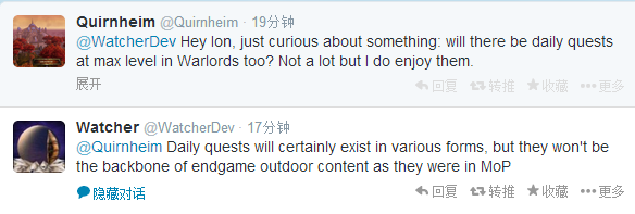 A:日常任务肯定会以不同的形式存在,但是它们不会再像是在MoP那时一样,成为野外游戏内容的主体部分了。