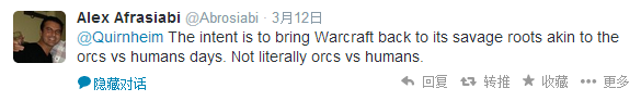 A:设计意图是让魔兽回到它的野蛮本源类似于兽人VS人类的时候。并不是字面意义上的兽人VS人类。