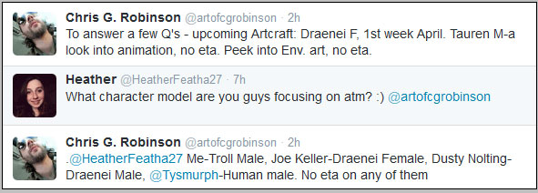 我来回答一下大家的问题好了——即将发布的艺设更新:女性德莱尼,四月第一周。男性牛头人-动作动画演示,时间待定。环境设计预览,时间待定。