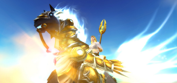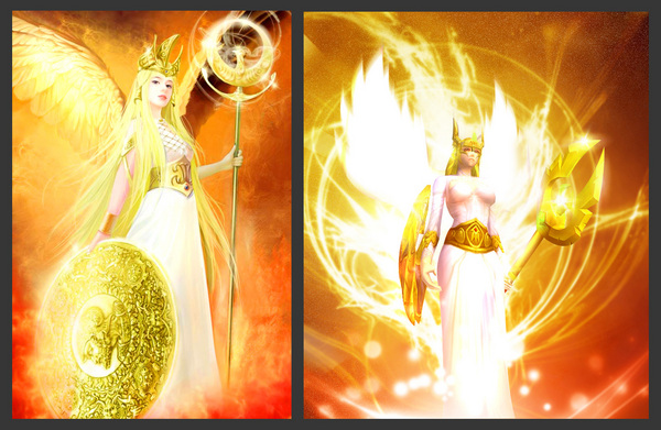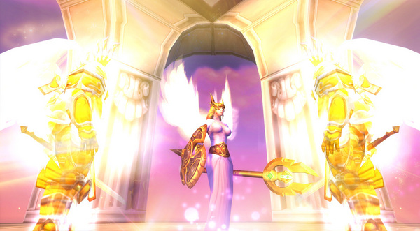 女神服饰详解:白色婚纱,残忍腰带,元帅的头冠,精制恐怖角斗士的冥想护腕,辛多雷金杖,古树之三联盾牌。