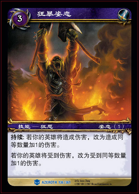 在TCG卡牌中,狂暴姿态作为战士卡牌出现,效果为攻击或受到伤害时,均会获得额外1点效果。