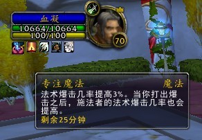 简介:给队友上专注魔法的BUFF,一般给高爆法系队友(鹌鹑,元素萨,神圣骑,恢复萨,法师),以提高队友3%爆击率,当队友法术爆击的时候,你的爆击几率也会提高3%。