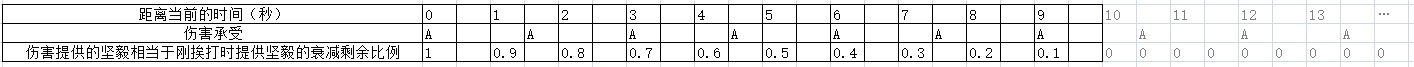 <3>和<4>怎么理解?我认为是每次攻击提供的坚毅在10秒内随时间单独衰减,10秒内受到的所有伤害提供的衰减与未衰减的坚毅为当前总坚毅。依 然有点拗口是吗?那么假设一个坦克承受一只会平砍的boss 1.5秒一刀的伤害,那么很容易得到下列表格: