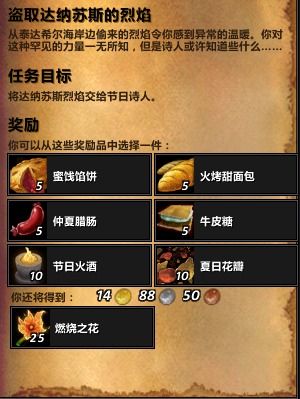 如果你把对立4个主城的偷取火焰任务全部完成之后,你将会在己方的NPC哪里接到一个新任务:小偷的奖励。这个任务奖励一个节日装备:火焰节庆之冠(注意,这个头盔跟成就里的"木杆热舞"成就需要的火焰节套装没有关系,但是这个任务本身是一项成就奖励。所以这个任务也是必须做的。)