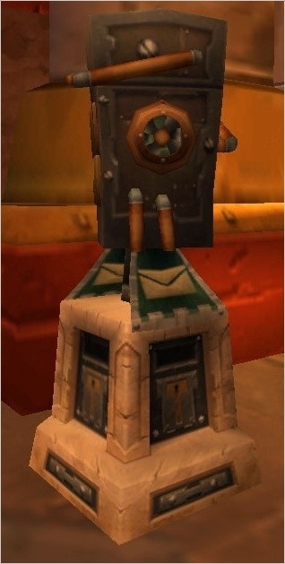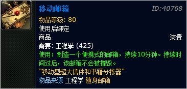 巫妖王之怒中工程学多了个移动邮箱图纸,这个邮箱居然叫MOLL-E,这个小装置来自《机器人总动员》里可爱的小机器人Wall-E。其说明是"邮件分拣机",而wall-E的功能是废品分拣,嗯,听起来差不多。