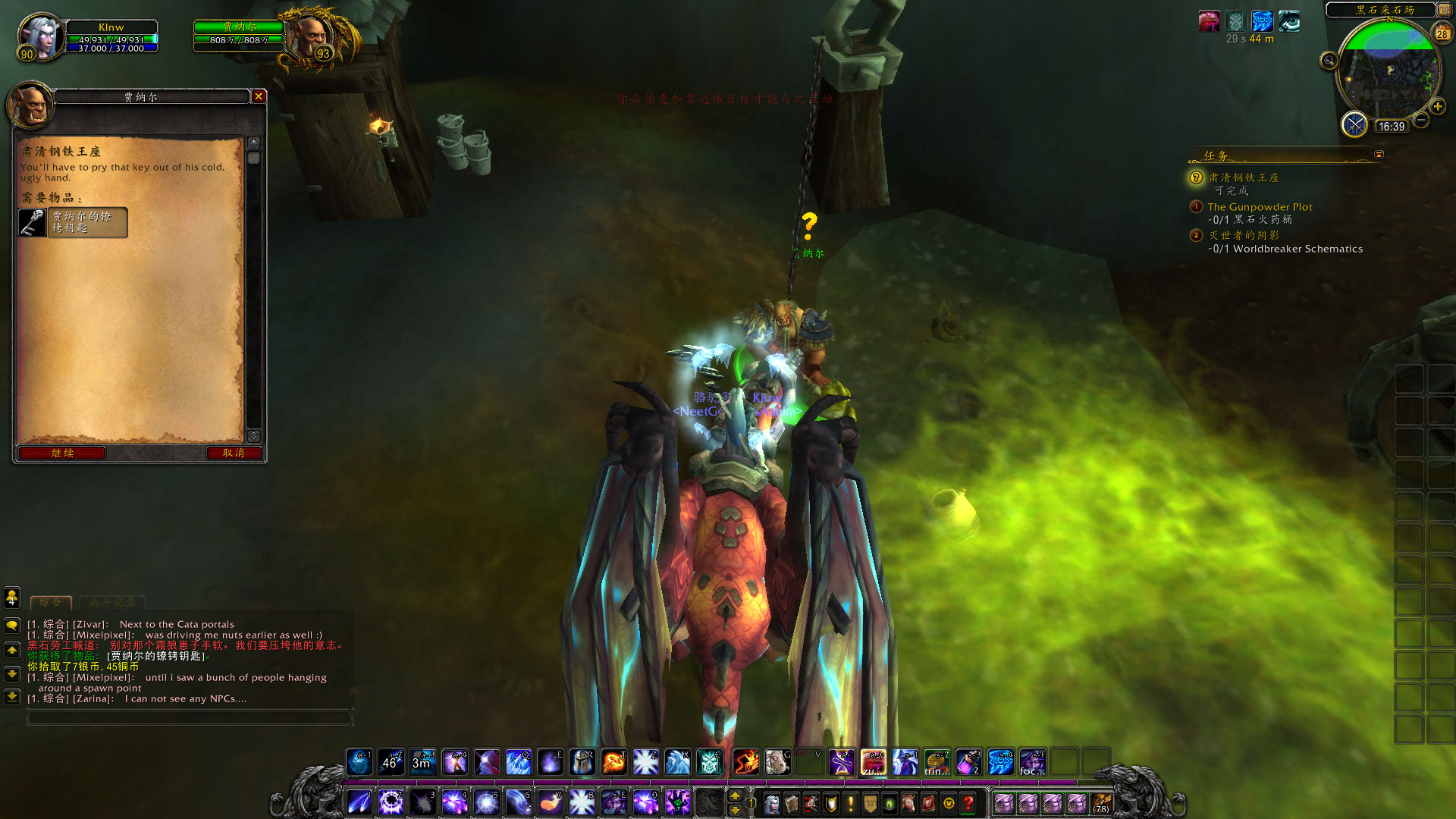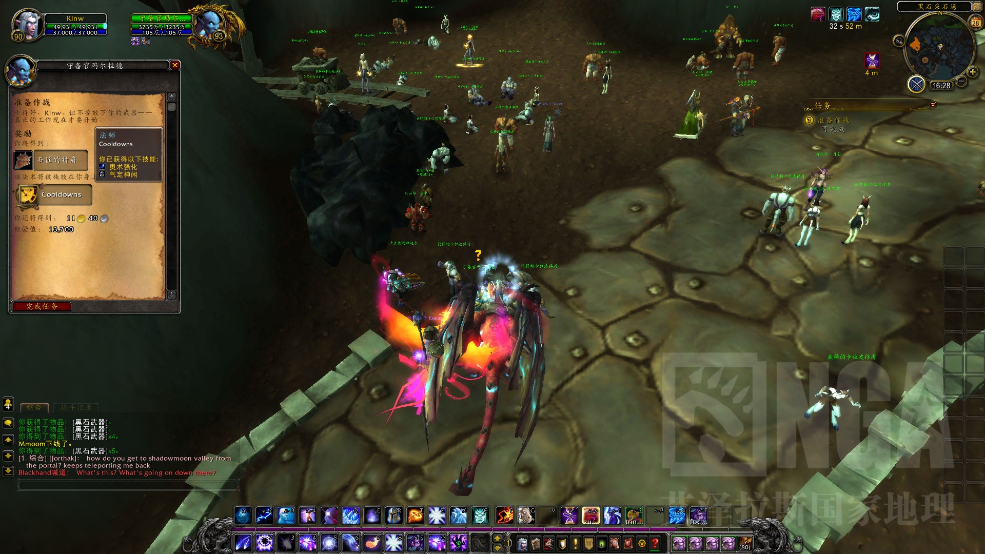 在洞穴被某个术士/萨满?(好像是耐奥祖)弄塌之前,卡德加用集体传送带到了洞穴后方,正好到了黑石采石场,抢夺了敌人的武器。