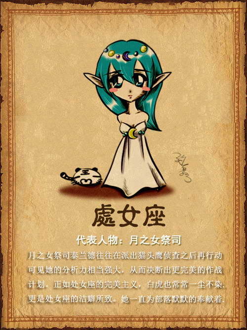 狮子座无疑是最喜欢玩魔兽世界的一类人了,团队指挥、处理工会这种领导的事情他们都爱干。正直公平、拥有崇高精神的狮子一定是信仰圣光之力的人,冲在最前线,打最高的DPS,治疗最高的血量,都是狮子确认自己地位的重要因素,就算为此花钱花时间他们也毫不在乎。狮子座的人物角色一定是美型的精灵或者人类,如果你看见狮子座正在练圣光以外的职业,那么他们的圣骑士和牧师一定已经毕业了。
