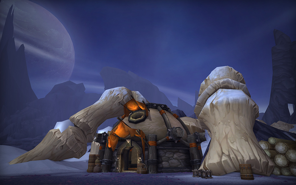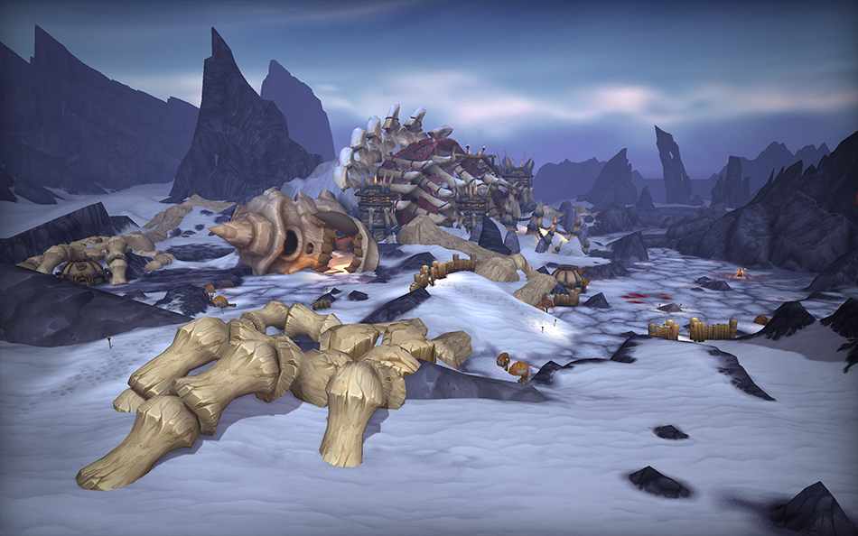 在这里我们可以表现出曾经的食人魔与现在的呆瓜食人魔之间的文化差别。但要说我最喜欢的地方,那就是东边的龟裂平原了。这片巨大的冰湖周围满是巨人和各种野兽,它们会经常深入冰湖寻找食物或别的什么东西。在这里你可以看到戈隆在冰面上奔行,猎捕裂蹄牛或者霜狼,或者被雷神氏族的巨人追猎者捕杀。巨大的玛戈隆穿行在空旷地区杀死任何看到的活物,它们忠诚的鬣蜥人拾荒者则把玛戈隆的残羹剩饭吃的一干二净。同时,在很多冰块碎裂的地方,在黑暗深渊中形成的物体开始窜出地面。这里一定能让你感受到德拉诺的野蛮,这里也是各种巨人最多的地区。