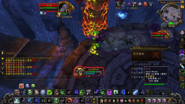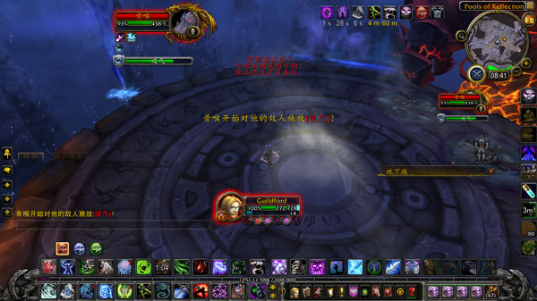 位面转移和虚空漩涡是组合技,BOSS会用位面转移随机传送到一名玩家身边,随后开始引导虚空漩涡,将玩家拉向漩涡并造成暗影伤害。由于是单刷,因此BOSS基本上会原地传送,漩涡开始引导时死步跑开。漩涡即将结束的时候跑回BOSS身边,这和下一个技能有关系。
