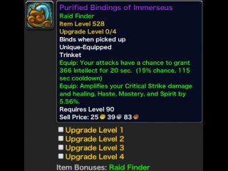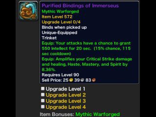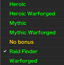 既可以表示"神话战火"的版本,也可以表示"团队查找器难度"的版本,一共可以表示"随机"、"普通"、"英雄"、"英雄战火"、"神话"、"神话战火"这6种版本的装备。6.0版本上线后,已经获得的SoO装备不会变化(当然目前的"英雄"变成了"神话"),新获得的SoO装备将会使用新的装备系统和物品ID。