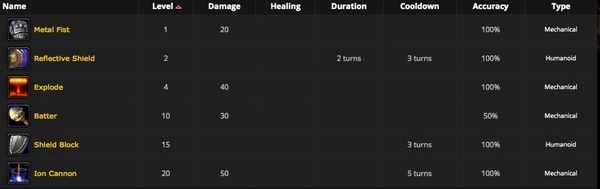离子炮:立即造成50点机械伤害。使用者之后必须充能2轮。在充能过程中,你无法做出任何其他动作。需要等级20,100%命中。冷却5轮。