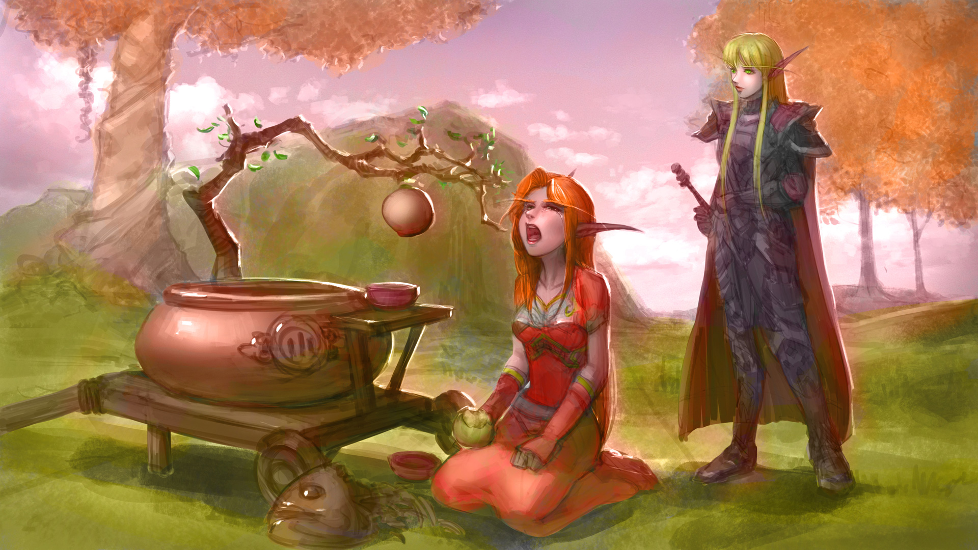 血精灵蒂娜走过去坐下,吃了一口说:"对!就是这个味儿!!"然后就狼吞虎咽的吃起来,这是她回来后第一次这么过瘾的吃上一顿。