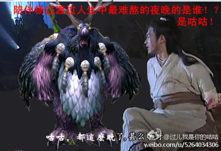 (咕咕的魔兽)当杨过断臂摔入悬崖不顾一切救他的,是咕咕。 喂他吃蛇胆给他解毒的,是咕咕。 教会杨过失传武学敦促他永不放弃的,是咕咕。 陪伴杨过渡过无数难熬的夜晚的,是咕咕。 当杨过功成名就美人在侧时依然不离不弃的,是咕咕。 有咕如此,夫复何求!?