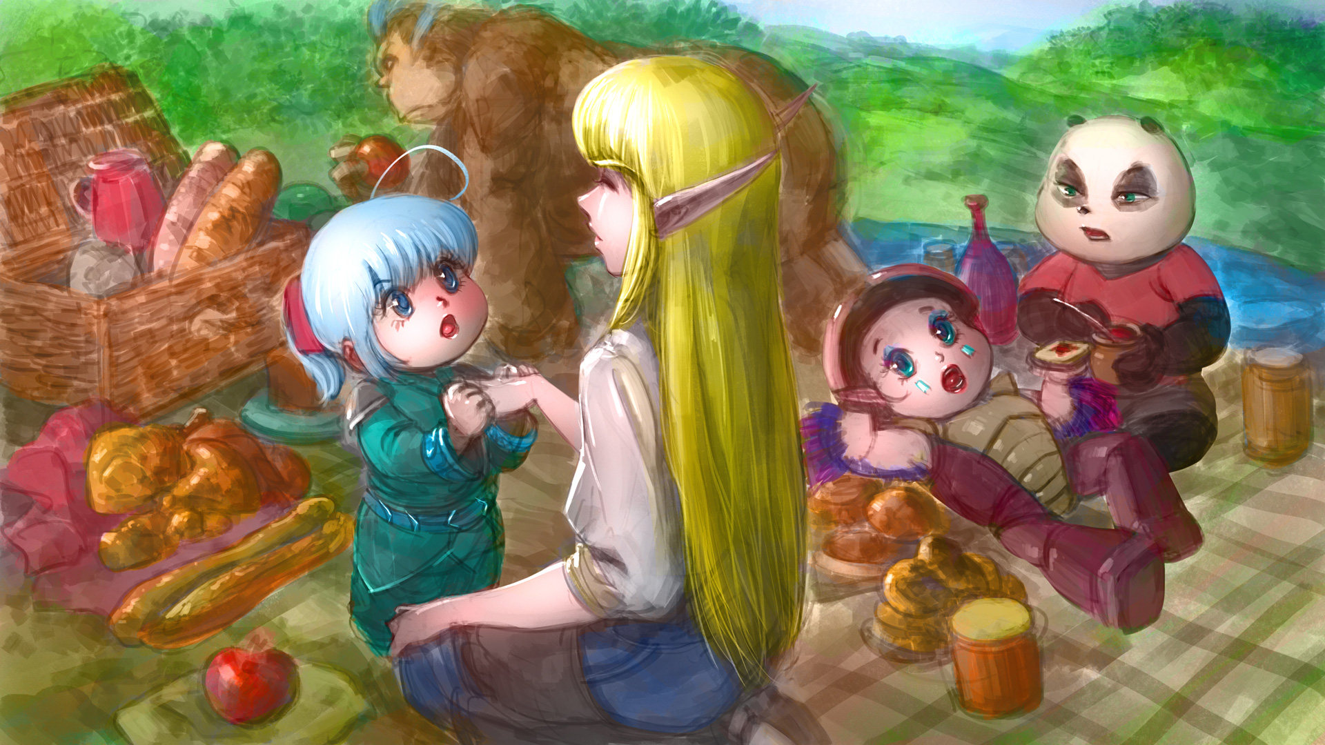 血精灵艾文带领小开毛毛和莎莎在阿拉希高地的边缘地带活动。虽然是短程的外出活动,熊爸爸依然为他们准备了很丰富的食物。休息用餐的时候,莎莎看着正在准备食物的艾文,情不自禁的握住了艾文的手~~~