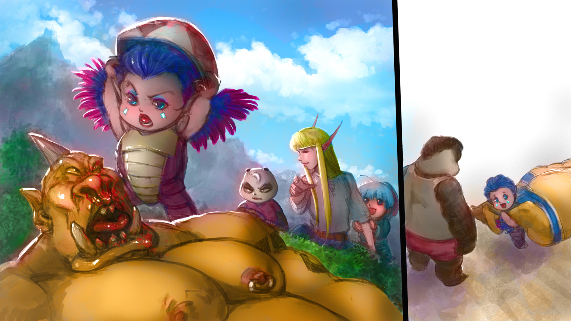 毛毛拍晕了个肥胖的食人魔后,不顾艾文的劝阻,愣是把食人魔拖回到希尔斯布莱德熊爸爸的家。