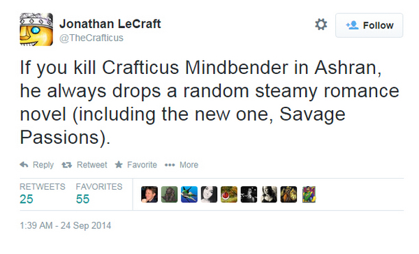 如果玩家在阿什兰击杀克拉提库斯·曼比德尔,他必定会掉落随机的一本浪漫小说(包括最新的一本《狂野激情》)。