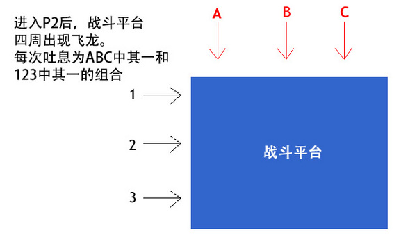 第二个阶段是扎伊拉暂时消失,大量的飞龙会出现在战斗平台的四个方向,开始向一条线喷火,喷火的原理是,平台的每条边被三等分,喷火每次覆盖其中的一等分。主要难点在于,此时场上会出现3个龙骑兵,他们除了正常攻击仇恨目标以外,还会使用锁链来将远处的玩家拉到身边。也就是说,即使玩家通过走位避开了喷火,也完全有可能被龙骑兵拉回喷火范围。这里需要的是坦克对3个龙骑兵的位置的大致控制和其他玩家自身走位与自保能力的掌握。同时,还需要输出大量的DPS来击杀这3个血量并不算少的龙骑兵。