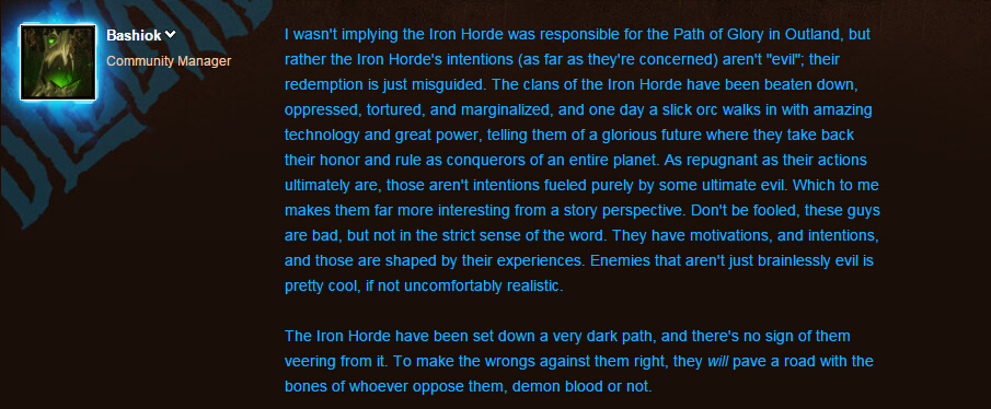 日前,玩家在暴雪官方论坛热议钢铁部落的相关故事,魔兽世界社区经理Bashiok也加入了讨论的队伍,分享他个人对钢铁部落的理解和看法!一起来看看!