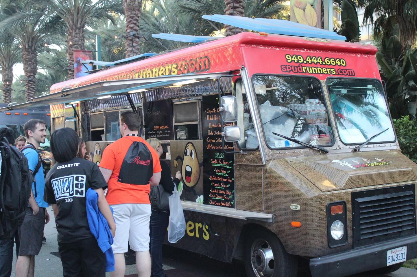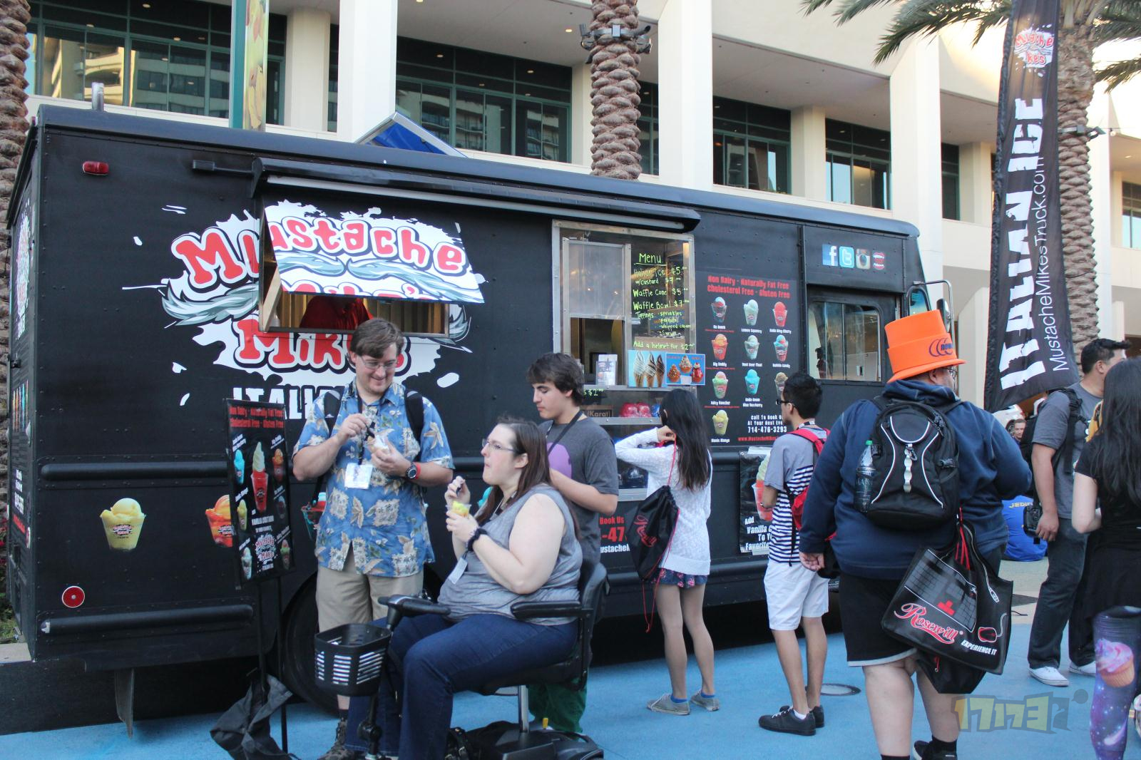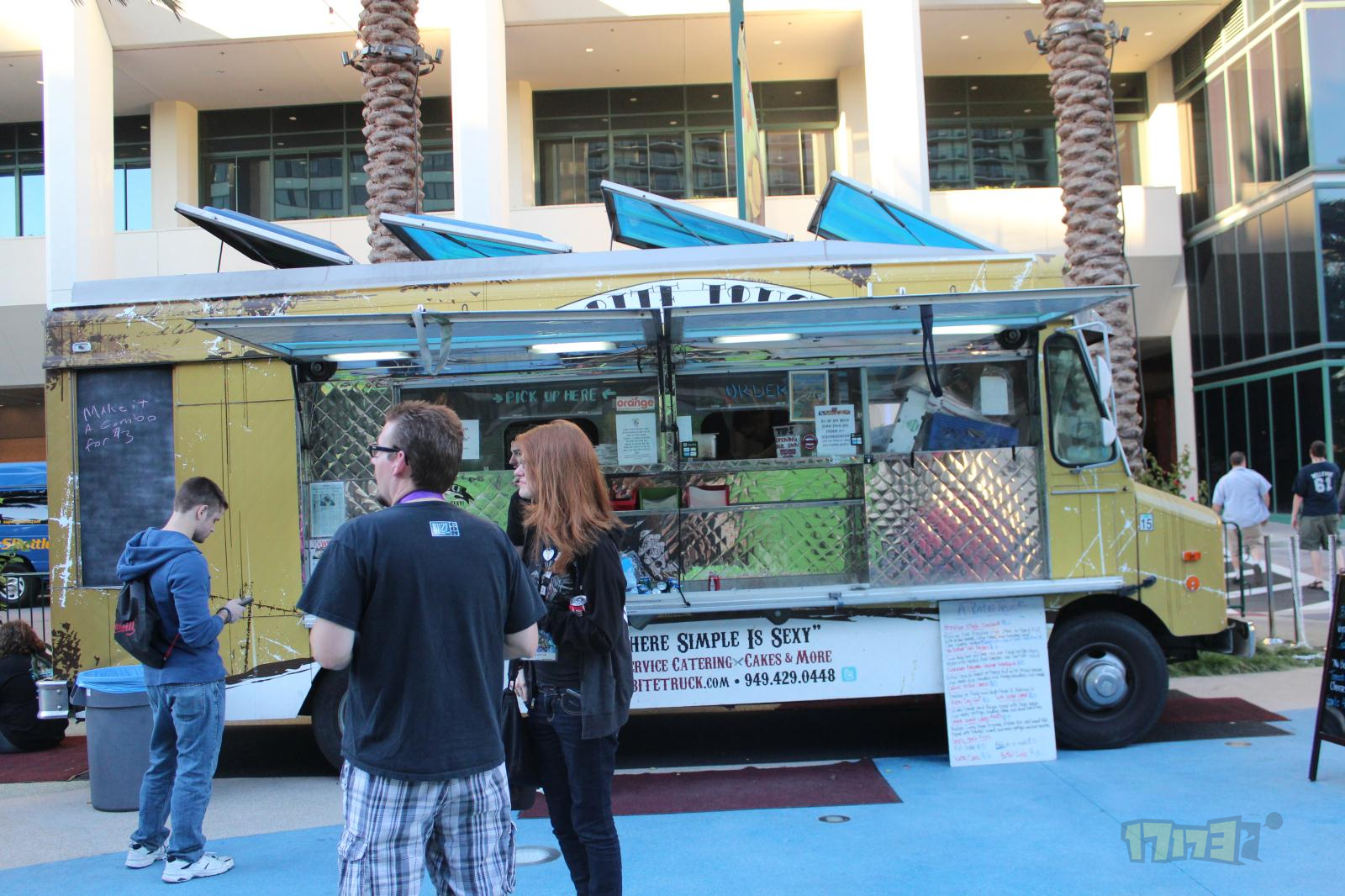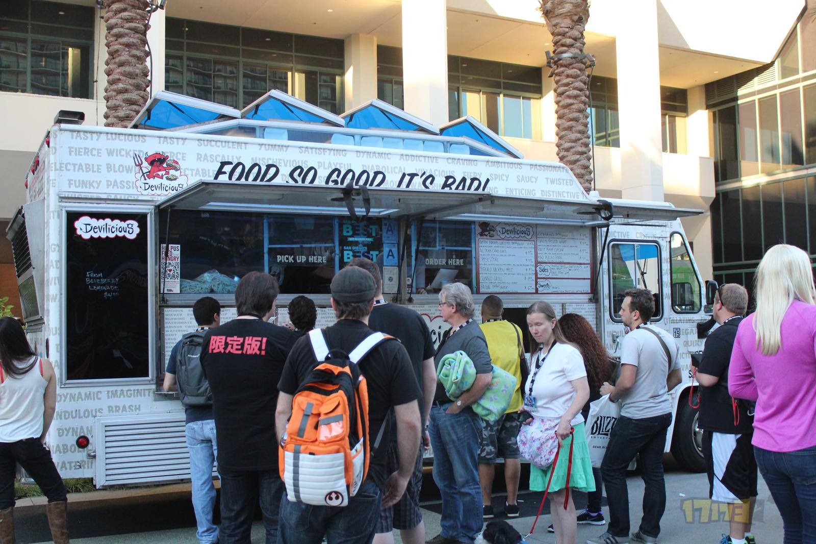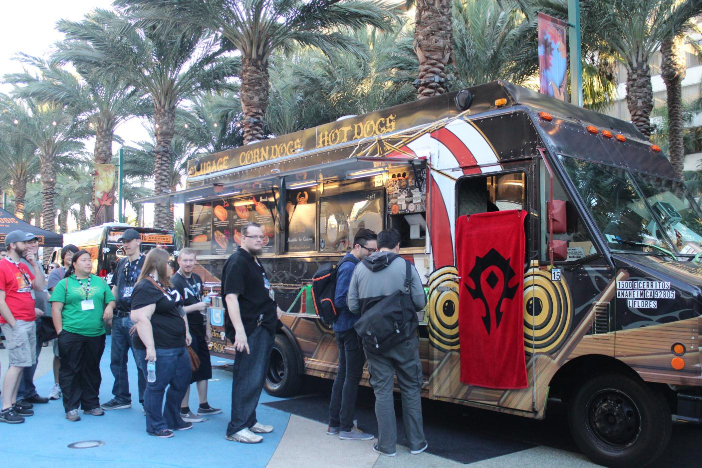 今年的暴雪嘉年华跟往年相比,场馆大了不少,据小编向暴雪员工的咨询,今年暴雪包下了整个安纳海姆会展中心。场地大了,暴雪粉丝也就更多了,那么逛累了怎么办呢?别担心,场馆门口可是排着好多辆特色餐车呢!