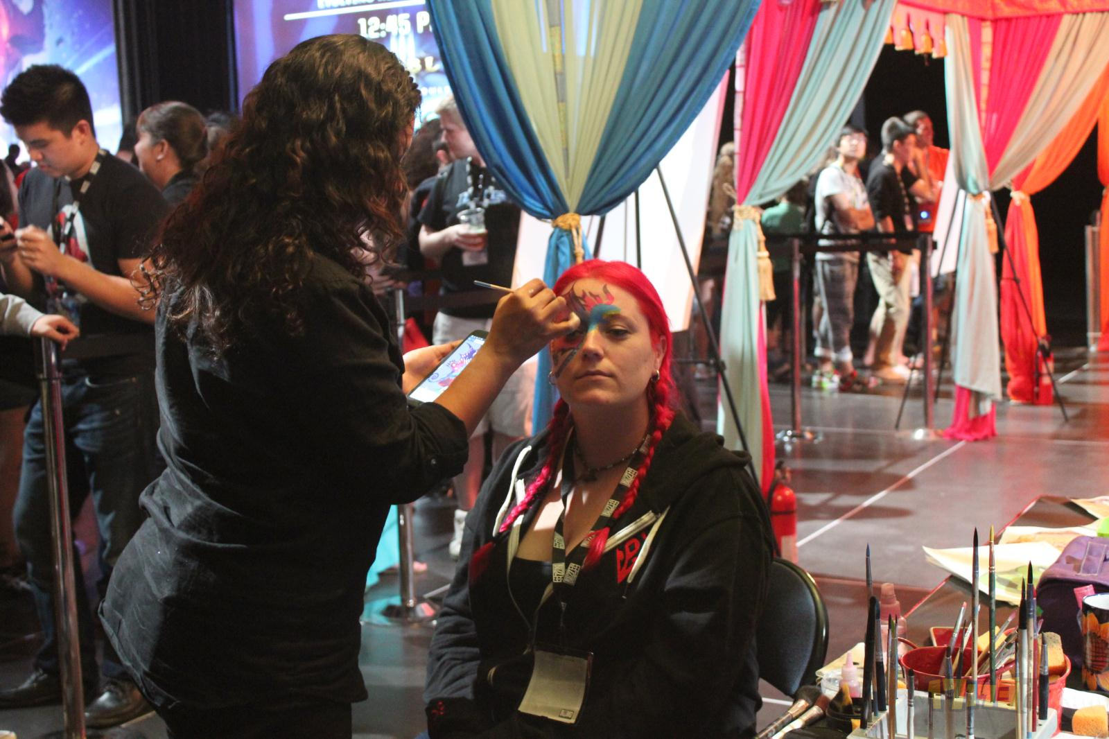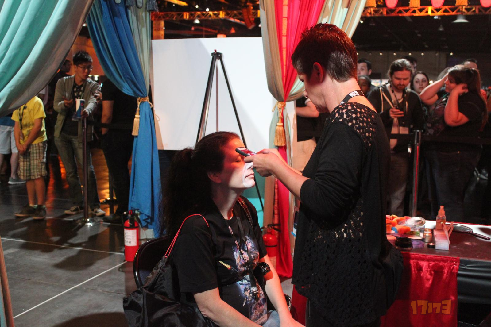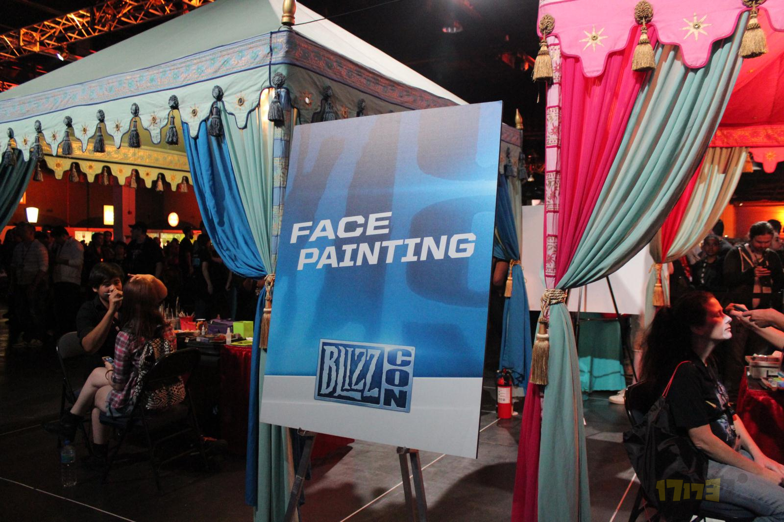 接下来看看现场化妆的特色小站,在这里,你可以给自己脸上画上图案,变身游戏里的人物;也可以在身体纹上你喜欢的标志,比如部落或联盟等等。