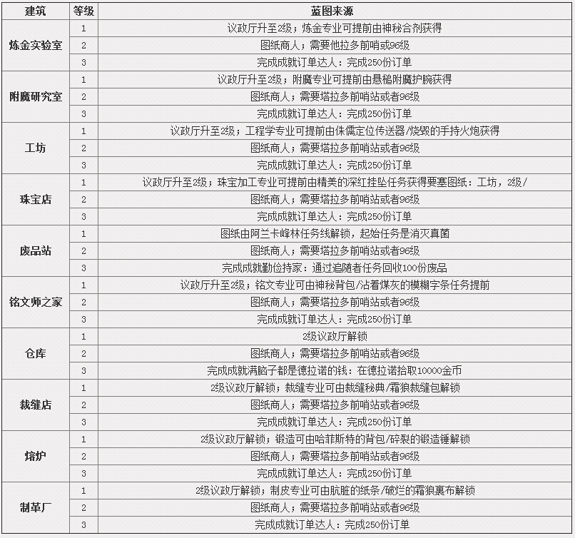 在魔兽世界6.0团本开放前,大家都在忙着建造自己的要塞。要塞可以给予装备奖励,额外Buff以及各种资源!要塞的每一个建筑在升级时都需要先学会对应建筑蓝图,那么今天我们就列出了各建筑蓝图/图纸的出处 ,方便大家查找。