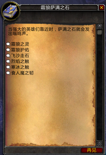 要塞里萨满之石一共可以提供6种增益,其中2种是默认就有,另外4种都需要你在霜火岭找到相应的石头点一下之后,家里的石头就会多一个功能。