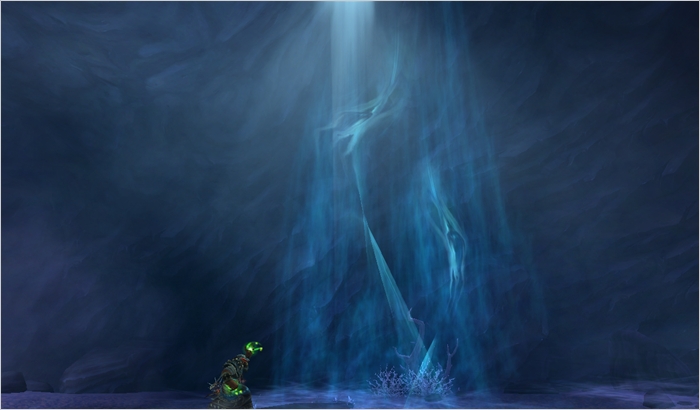 虽然霜火岭的自然环境恶略,但也不乏这种温暖潮湿的岩洞存在。在沃尔高霜狼氏族的大本营,便存在着这样一个洞穴,它被德雷克塔尔称作寓言池。岩洞中水面释放出的温暖蒸汽和洞顶射入的日光完美的混合,加上这位伟大的霜狼先知的引导,于是形成了一股自下而上的流体,神秘而充满力量。霜狼氏族的先知们将氏族的寓言反应在洞内的水面上,以供霜狼兽人们查看。