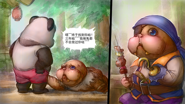 一天清晨,熊爸爸听到院子有异样的声音,出去一看,一个全身伤痕累累,衣衫褴褛,奄奄一息的小海象人趴在地上,原来是在诺森德大陆被熊爸爸坑的小海象人小翔;海象人小翔被熊爸爸坑了后,人财两空,被全村的海象人耻笑,受不了的小翔偷跑出来,先是跑到卡利姆多,一上岸就被几个兽人抢光财物,还被劫持到城内做苦力,后来又逃到荆棘谷,又被那儿的地精贩卖到矿山做苦工,折腾了近三年,才又跑出来,找到了熊爸爸这里,而且右眼和左手都受了重伤。对于小翔,熊爸爸还是很愧疚的,那时实在是没办法,为了钱才做了这样的错事。熊爸爸把小翔领进屋,疗伤,换了身新衣服,眼睛上药先敷盖住,左手伤的太重,只得用钩子代替。熊爸爸让小翔留在家里疗养,答应小翔会还他钱,并且保证他餐餐有肉吃~~~~~