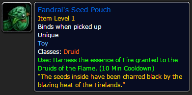 不过,在即将到来的6.1补丁中,暴雪在游戏中新增了一个小玩具:“范达尔的种子袋”,为德鲁伊职业限定,使用它就可以直接变身为火焰猫形态,10分钟冷却,没有次数限制。是不是比以前更方便了?