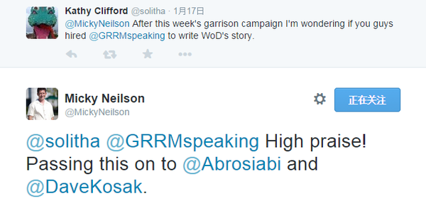 Q:这周的要塞战役做完之后,我想知道你们有没有聘请@GRRMspeaking来写WoD的剧情。(译者注:@GRRMspeaking:George R.R. Martin,《冰与火之歌》的作者。