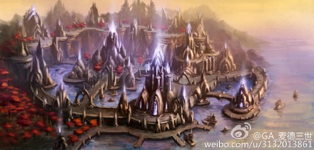 官网上发的沙塔斯内城设定图:上边是有启动护盾时的版本,下边是放下护盾时的版本,大家可以对比一下。其实要注意的是沙塔斯城是很大的,护盾中的只是中央内城而已(在燃烧远征里我们就剩下那个了)。然后我们可以从图中看出来,原来BC里收容难民的地方在以前它其实就是个湖! 目前两个水晶日常基本上算是二环(恶魔为主)和三环(暗影议会为主)的位置