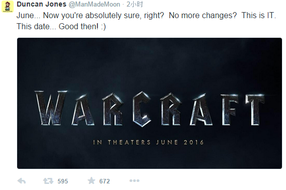 今天魔兽世界电影导演邓肯琼斯发布了一条推特,这是一张魔兽世界电影的新海报,上面标明了上映日期是2016年的6月份。