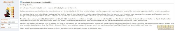 曾有传闻说暴雪在2015年5月13日一天内封掉了超过10万WOW帐号,他们是最有可能的所有Honorbuddy用户。对此我们想说的是,我们根本就没有那么多Honorbuddy的活跃用户。至于究竟是真正的外挂脚本监测,亦或是注入个人电脑的短期恶意软件扫描行为,我们并不能确定。