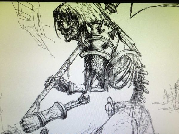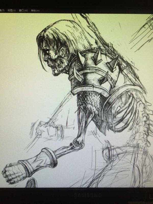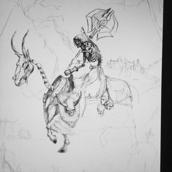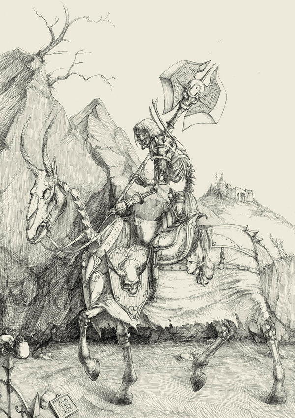 从4月5日创建文件,每天两个小时左右的绘图时间,这张画终于在5月27日凌晨完成了。本画风格和绘制手法参考借鉴了丢勒绘于1513年的铜版画《骑士恶魔与死神》;解剖学造型参考了《解剖绘画学校——动物》、《艺用人体解剖》等书籍。形象源于亡灵的死亡战马、亡灵高督战士。在此基础上进行了个人兴趣爱好的取舍加工细化或省略。