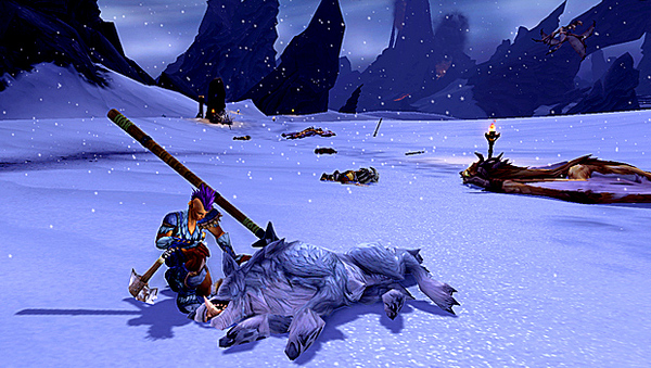 如果把这些元素放在偏离中心线的话,就会让画面更为平衡自然。不过拍歪了也没关系,构图的问题很容易通过剪切的方式进行后期处理。(下图的主体应该是霜狼和女兽人,作为背景的山脉不能占据太多面积)