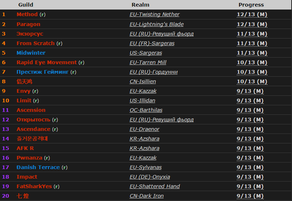 今天史诗地狱火的总体进度和格局依旧与昨天一样,唯一的亮点是国服佶天鸿公会达成了10/13M的进度,重新杀入世界排名前列。