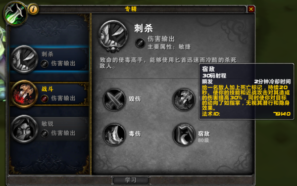 目前版本潜行者的天赋,主要是敏锐,和刺杀。(战斗贼实在是被NERF的太严重了,而且上个版本的战斗贼对抗野德也一直处在下风。)