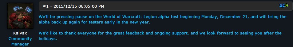 “我们计划将于12月21日周一开始,暂停魔兽世界:军团再临的alpha测试,预计将在新年后重新恢复。