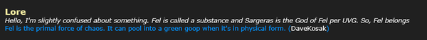 根据近几天Kosak的推特。萨格拉斯的“邪能之神”的头衔被解释为“因为他有很多邪能”。而邪能被Kosak描述为“原初的混乱能量”。所以邪能不是萨格拉斯创造的了——UVG果然靠不住。