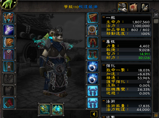 首先是装备和属性(装备都是110级PVP全能蓝装)