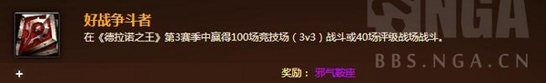 [好战争斗者]:在《德拉诺之王》第3赛季中赢得100场竞技场(3v3)战斗或40场评级战场战斗。