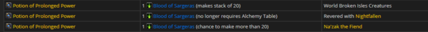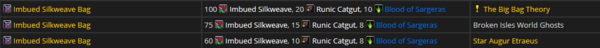 可以看到,7.1新出的背包,需要60-100个灌魔丝纹布和8个萨血,基础成本和夏多雷丝绸挂钩。再比如说新的炼金,一个萨血换20个甚至更多全属性加成药剂。等等